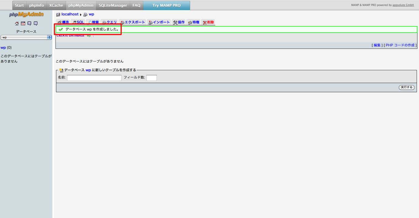 「データベース wp を作成しました。」というページが表示されたらデータベース(MySQL)の作成は終了です。