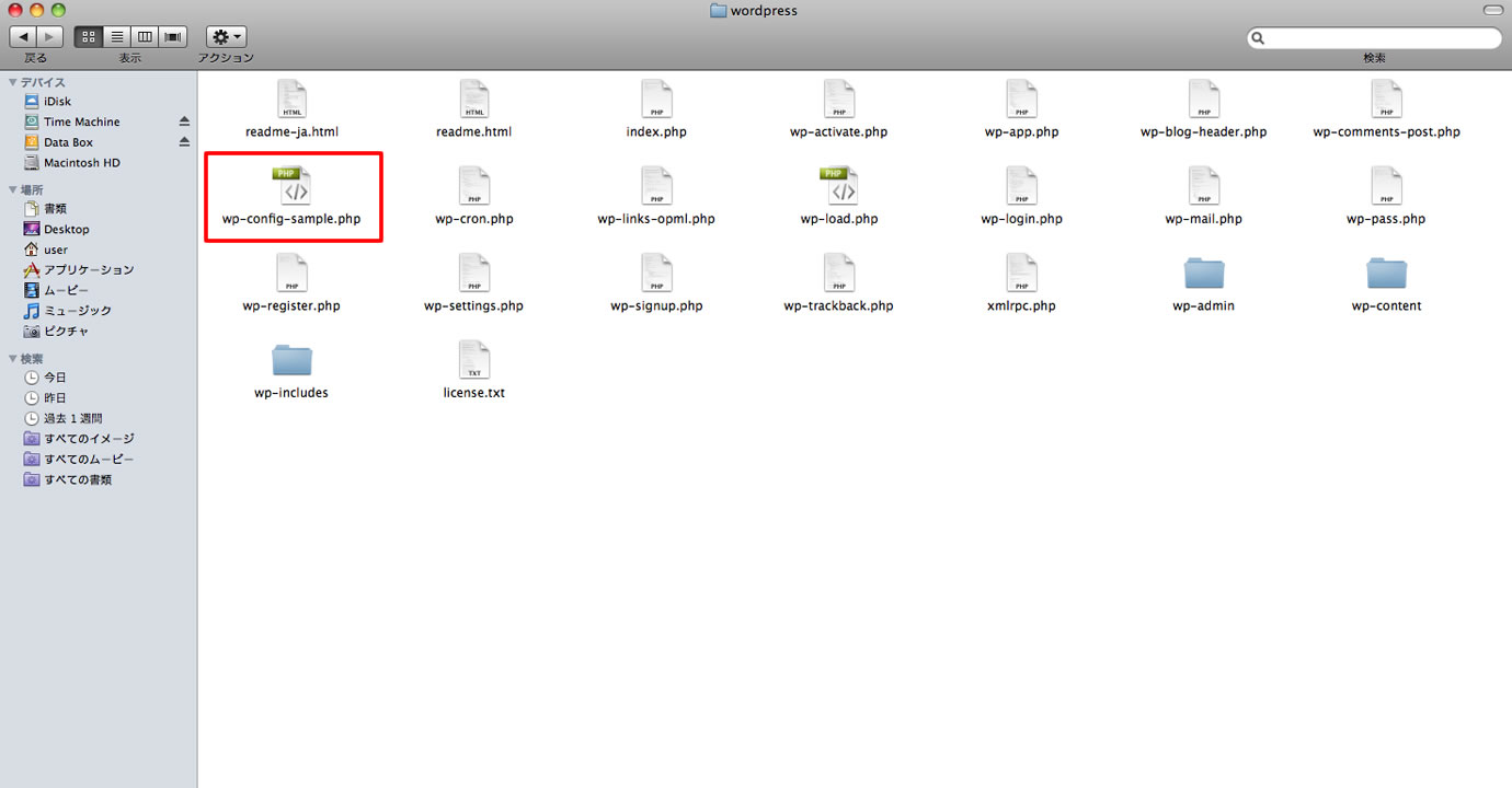 次に「wordpress」フォルダ内にある「wp-config-sample.php」というファイルの名前を「wp-config.php」に変更します。